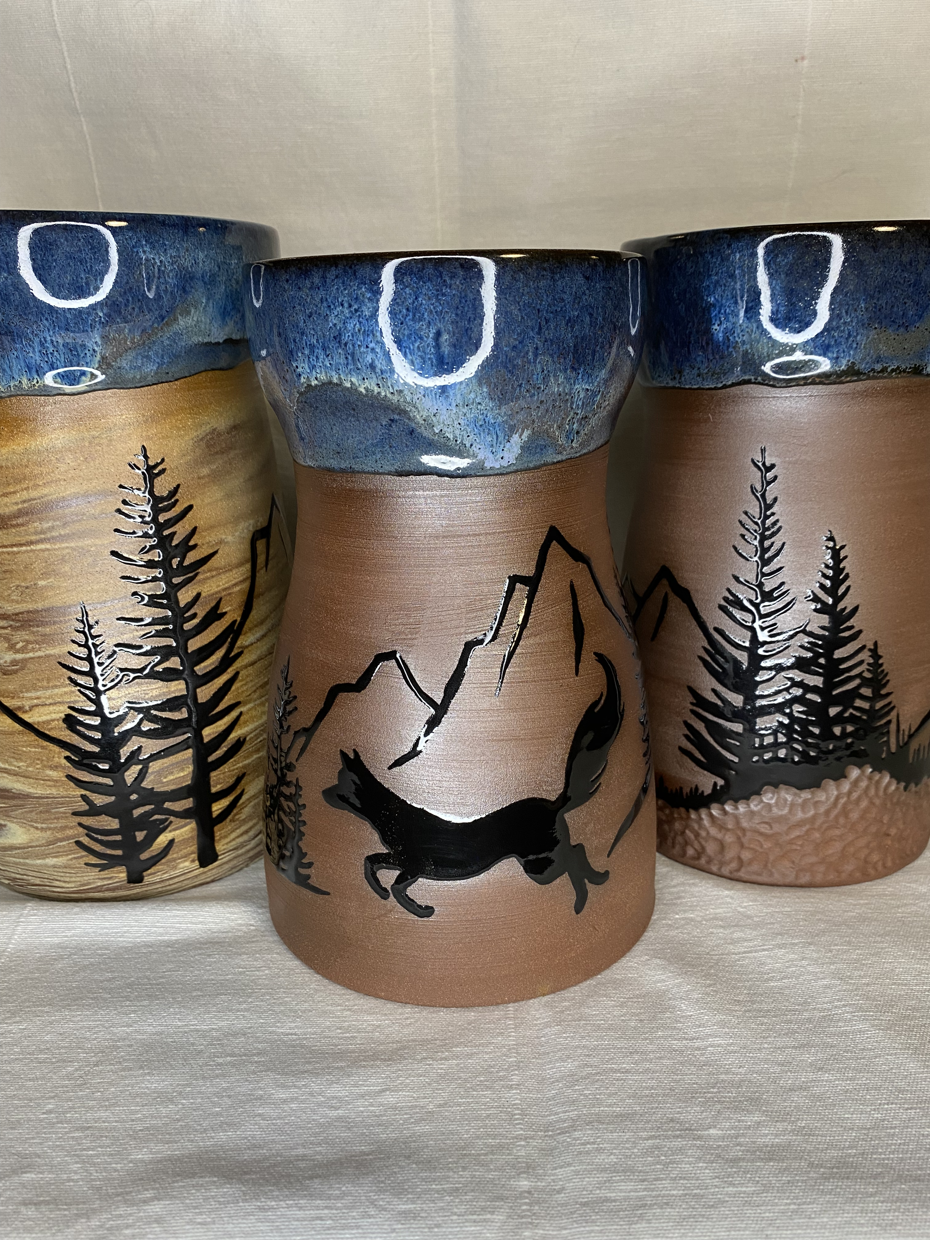Naked, “agateware” marbled clays, glossy animal silhouettes, vivid floating glaze colours