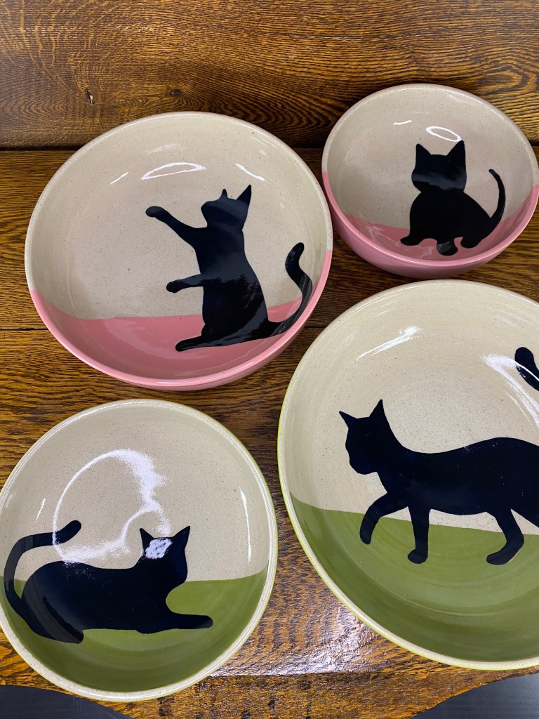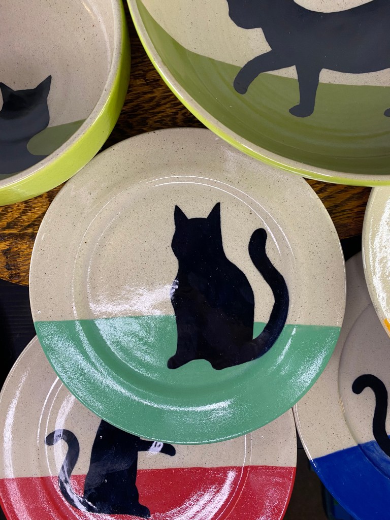Planters of all kinds, yarn bowls, and colourful cats